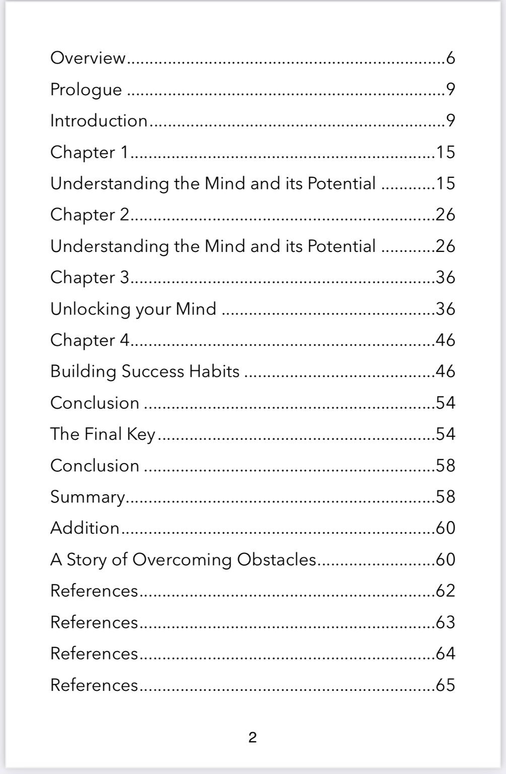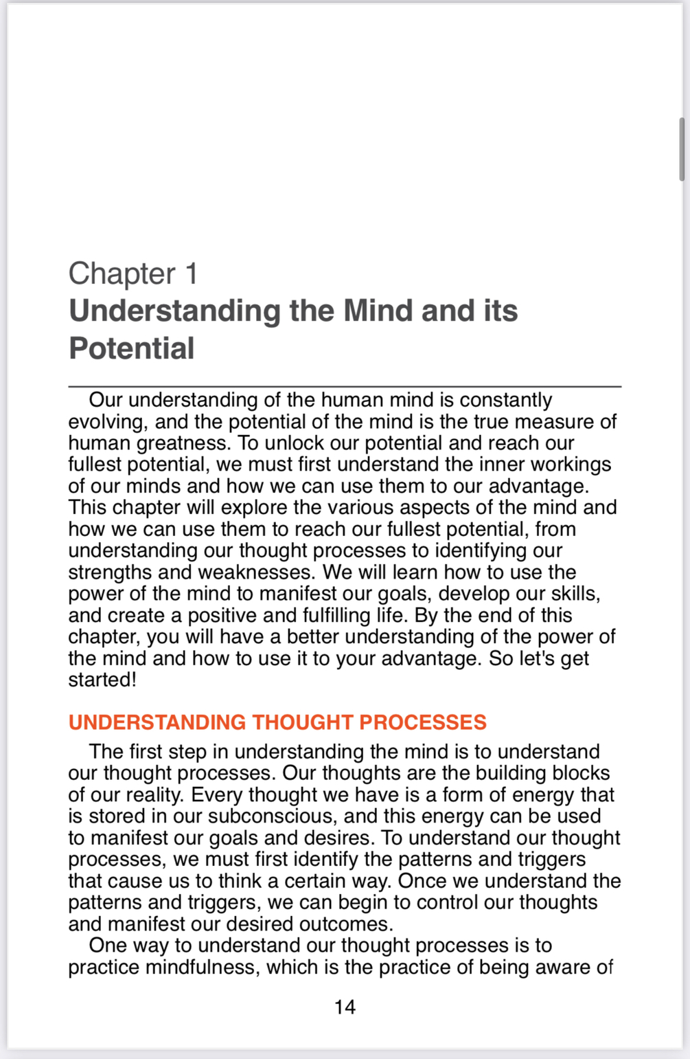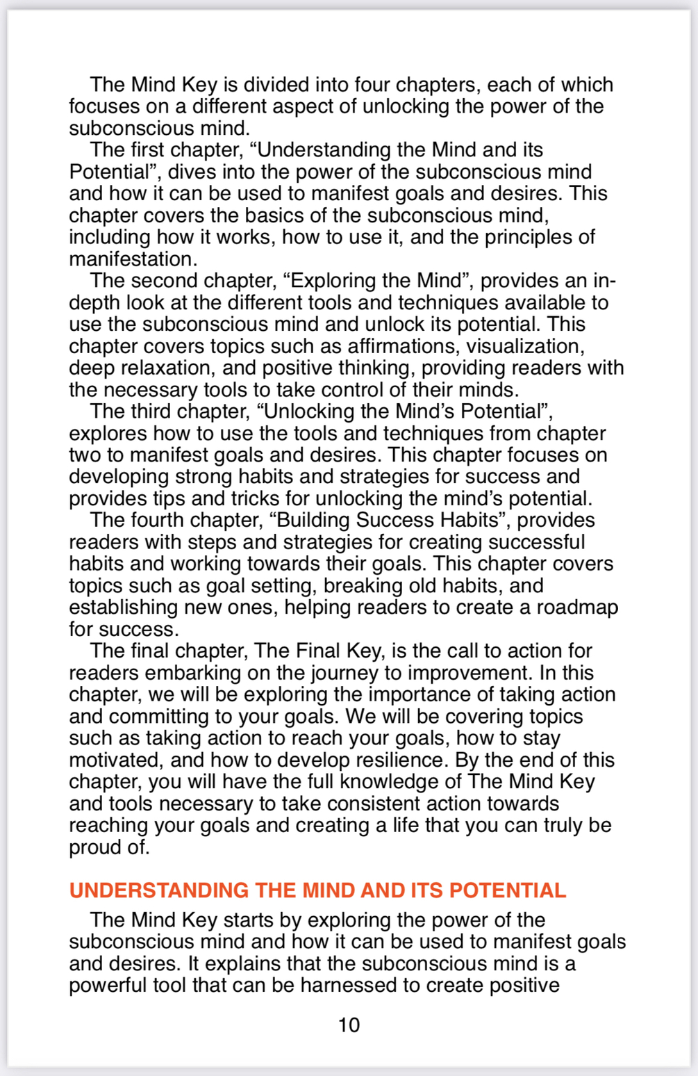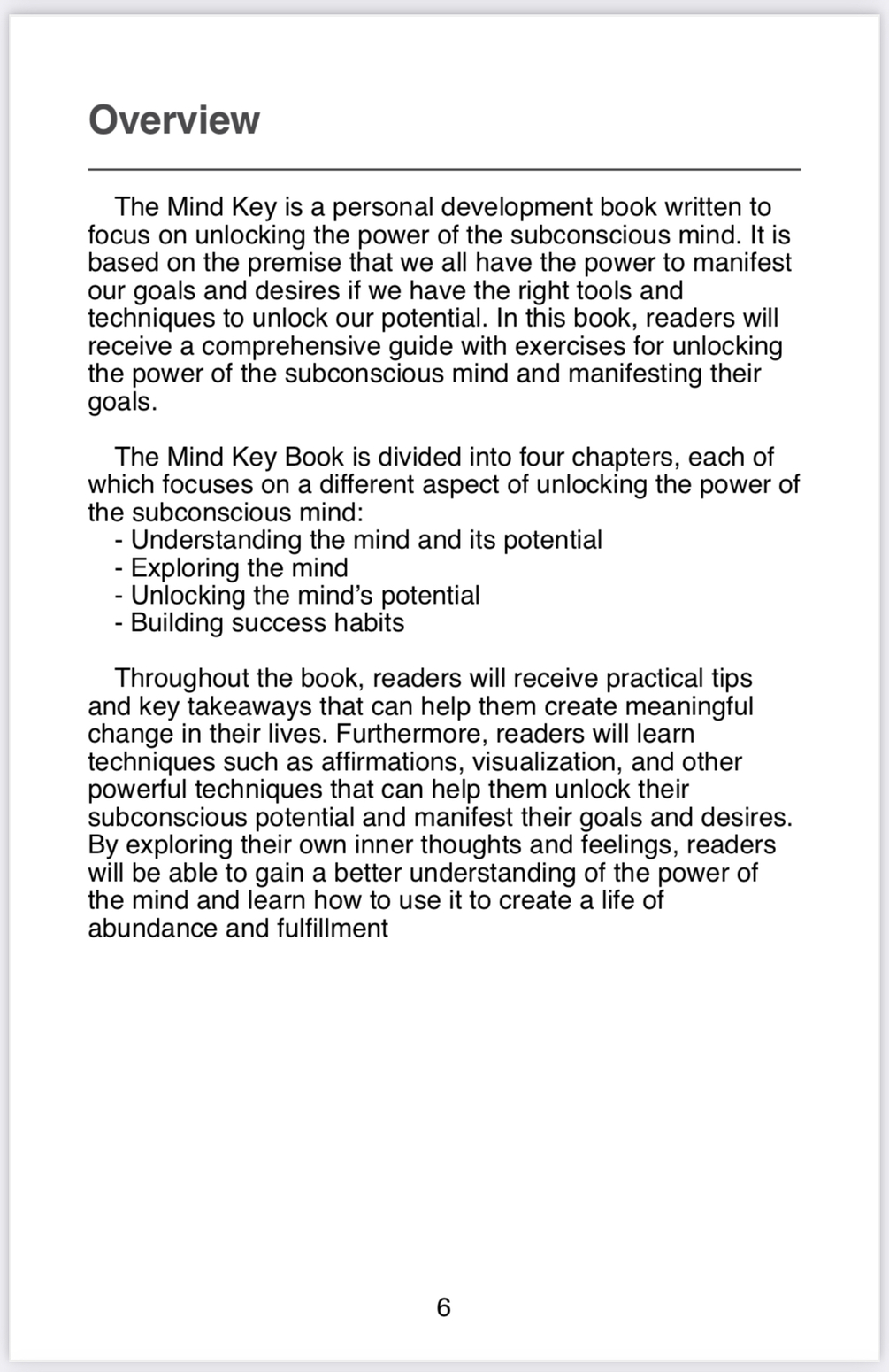 The Mind Key Book is divided into five chapters, each of which focuses on a different aspect of unlocking the power of the subconscious mind: - Understanding the mind and its potential - Exploring the mind - Unlocking the mind’s potential - Building success habits and The Final Key, a call to action for readers. Throughout the book, readers will receive practical tips and key takeaways that can help them create meaningful change in their lives. Furthermore, readers will learn techniques such as affirmations, visualization, and other powerful techniques that can help them unlock their subconscious potential and manifest their goals and desires. By exploring their own inner thoughts and feelings, readers will be able to gain a better understanding of the power of the mind and learn how to use it to create a life of abundance and fulfillment